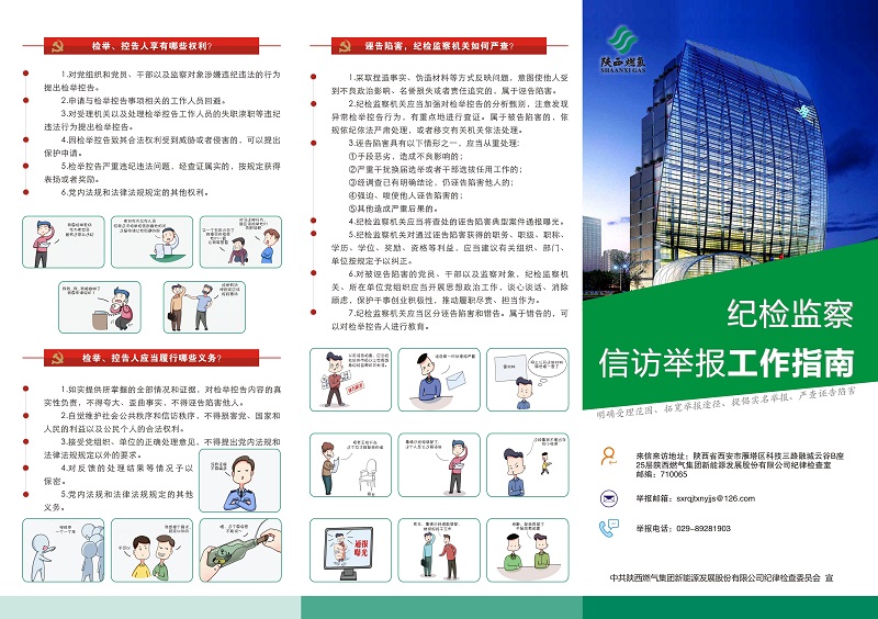 按照集團公司關(guān)于開展紀(jì)檢監(jiān)察信訪舉報工作宣傳年活動安排部署及新能源公司紀(jì)委印發(fā)的活動實施方案,公司及各控股公司設(shè)計印制了《紀(jì)檢監(jiān)察信訪舉報工作指南》宣傳冊。